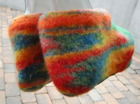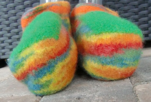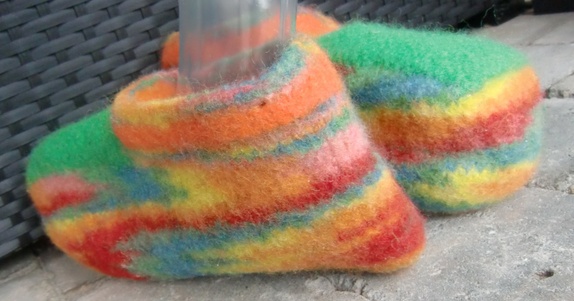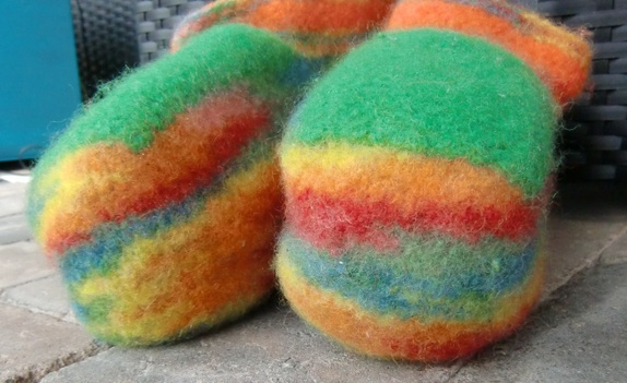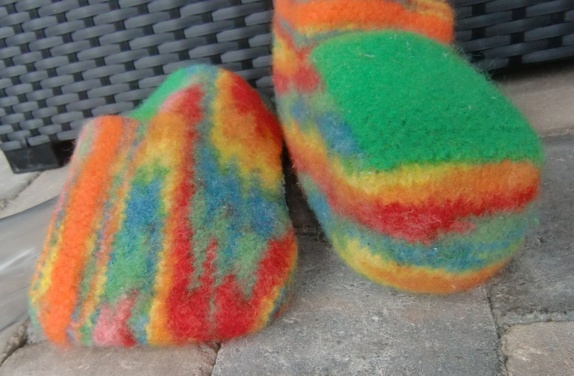Tova tøfler i multifarger med grønt oppe på foten.Tøflene har sklisåle under.