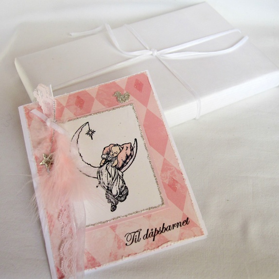 Kortet er pyntet med vakkert rosa designpapir, et håndstemplet vintage motiv av en baby i dåpskjole, fjær, blonder, bånd, en stjernecharm og en liten badeand i sølv glassglitter. "Til dåpsbarnet" er håndstemplet nederst.