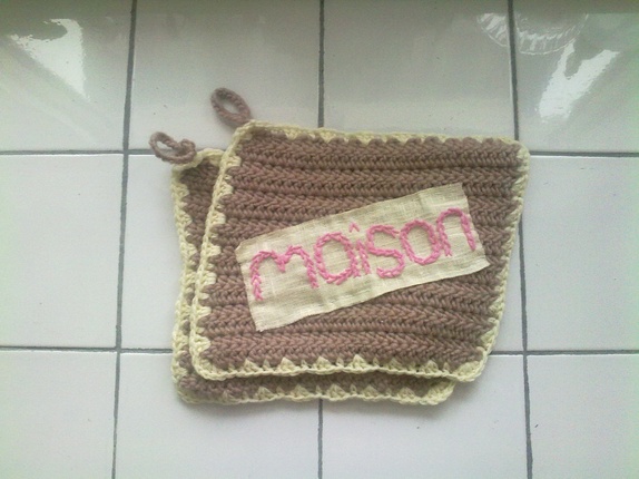Tøffe grytekluter med teksten "maison" som betyr hjem på fransk.