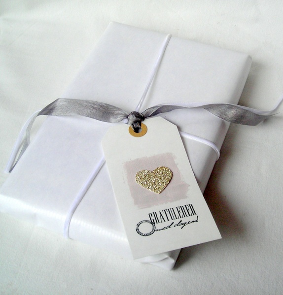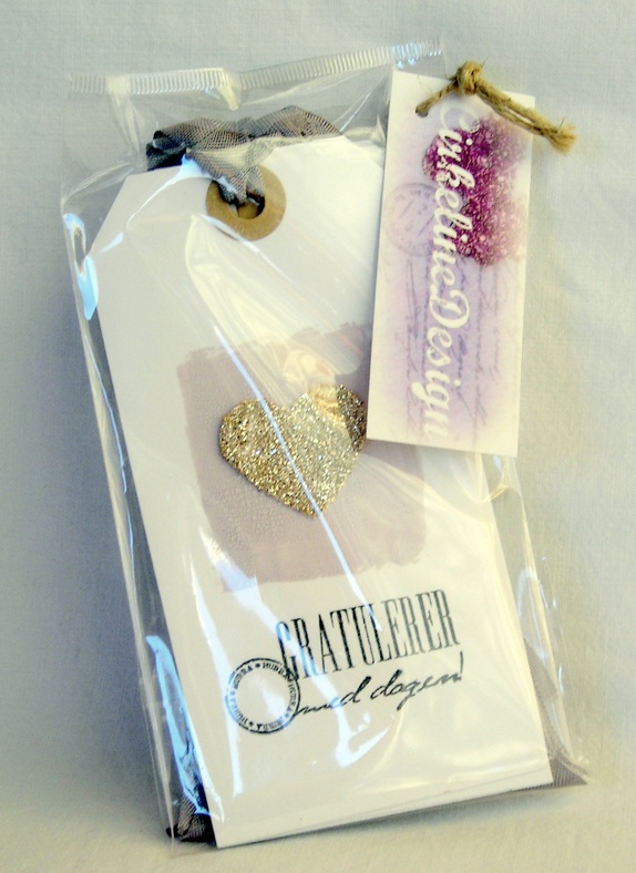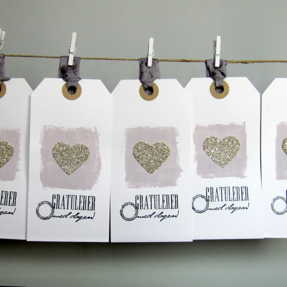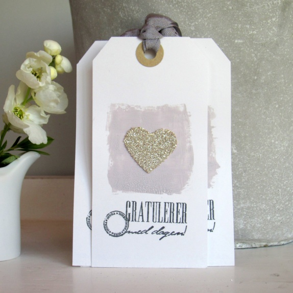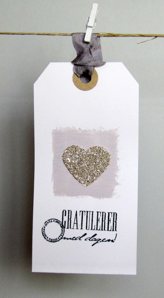 Motivet er et hjerte med sølv glassglitter og krakeleringsmaling i en nydelig grålilla tone. "Gratulerer med dagen" er håndstemplet i sort. På baksiden er det stemplet "Til" og "Fra", og det er plass til å skrive en personlig hilsen. Grå sløyfebånd hører med.