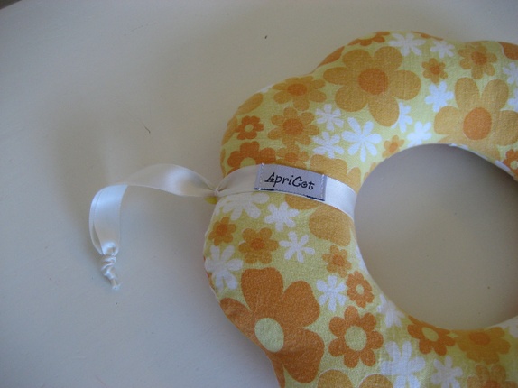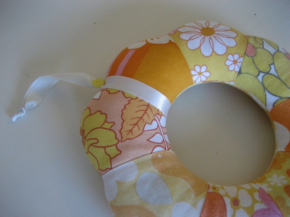 Fargene går i gult, orange og rosa. Baksiden er et flott retrostoff i gult, så kransen kan brukes på begge sider. Opphenget er et off-white satengbånd, pyntet med en vintage gul knapp. Kransen er fòret med strykeinnlegg og fyllt med fibervatt.