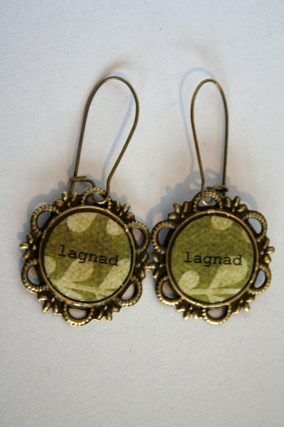 Eit par øyredobbar med nyreforma krokar. Ordet lagnad er printa på grønt scrapbookingpapir og limt på ein base av messingfarga metall. Dekt med lakk som gir blank overflate.