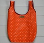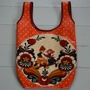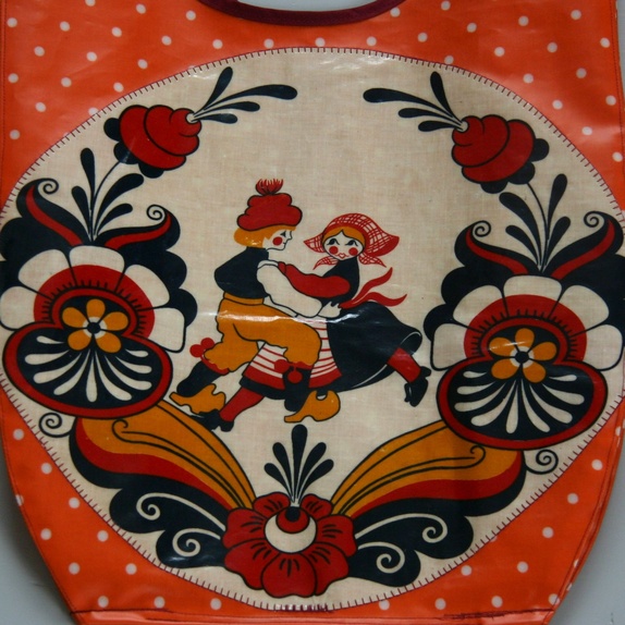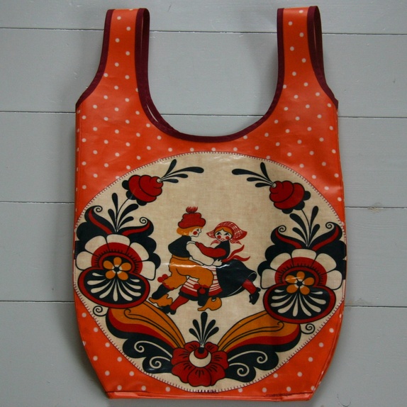 Denne er sydd av oransje voksbelagt bomull med hvite priker fra Tromsø Farvehandel og pyntet med et dansende par i nasjonalromantisk stil fra voksduk funnet på loppis (jeg tror mønsteret har opphav i Dalarna i Sverige). Langs hankene er det burgurnder skråbånd og bak på posen God som Grønn-merkelapp.