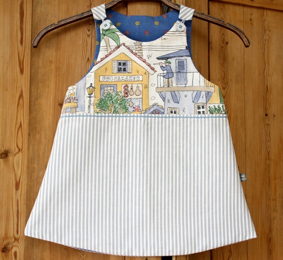 Søt, todelt Majakjole med Tobias i tårnet og pølsemakerbutikken fra Kardemomme by på brystet, og et blåstripet bomullsstoff på resten.