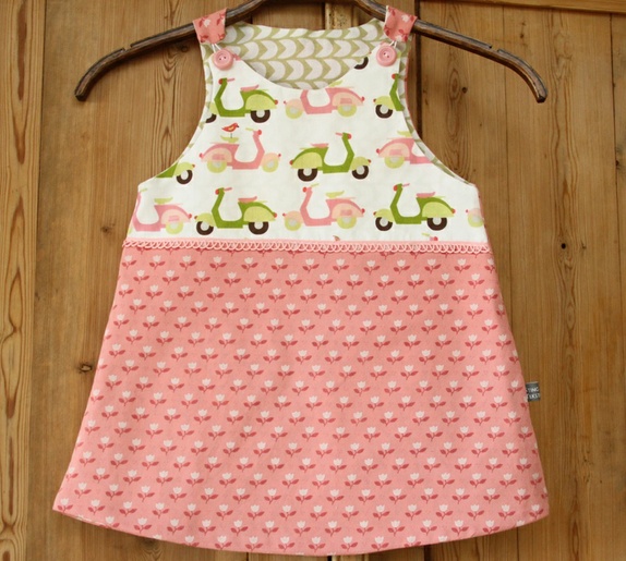 Søt, todelt Majakjole med tøft scooter-motiv brystet, og et rosa småblomstret bomullsstoff på resten. Scooterstoffet er i økologisk bomull, resten er gjenbruksstoffer.