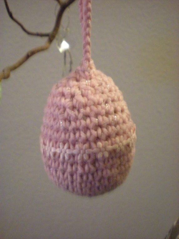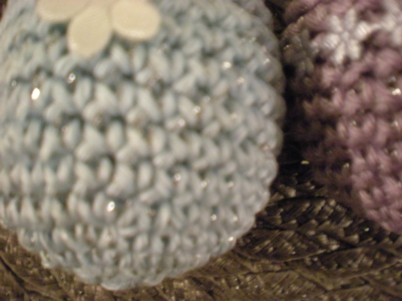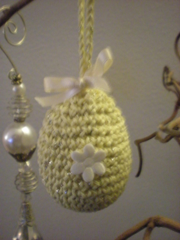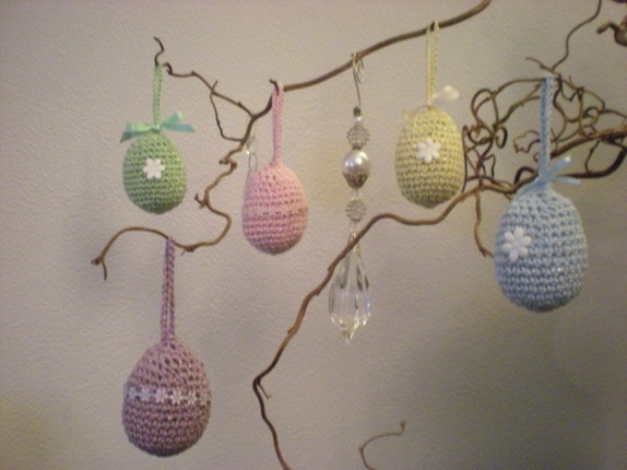 Små egg med oppheng heklet i bomullsgarn og tynn sølvtråd. Pyntet med bånd og blomster.