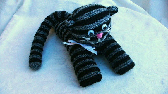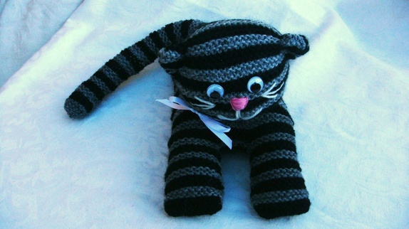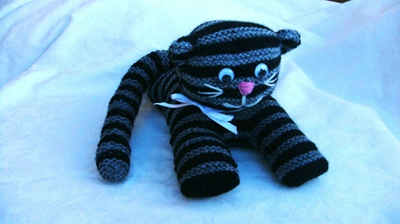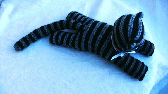 Katten er strikket i Viking garn( 60 % ull/20 % akryl og 20% nylon.). Det er brukt 3 veldig like grå farger på stripene ,men de er noe ulike og en sort farge.