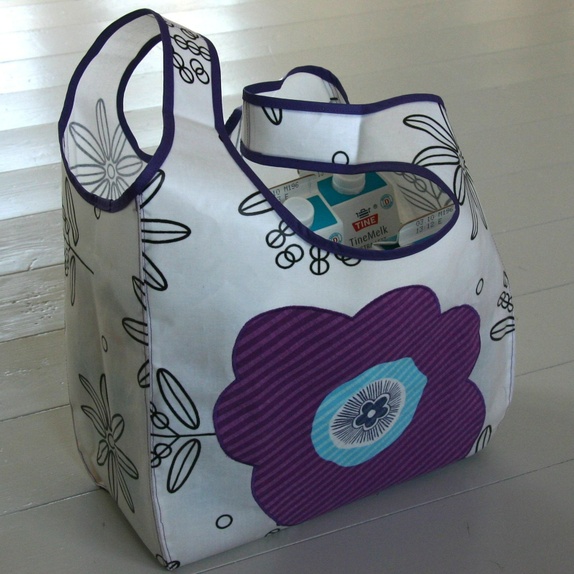 Posen er sydd etter modell av de i plastikk og rommer utrolig mye - du får enkelt en hverdagshandel i en slik - for helge- og høytidshandel trenger du nok noen flere. Den er mye mer behagelig å bære enn engangsposene og du slipper å engste deg for at posen ryker selv om du har handlet melk til hele familien (den rommer minst 8 liter).