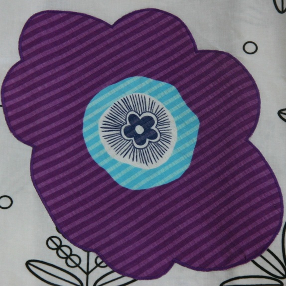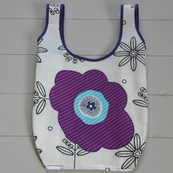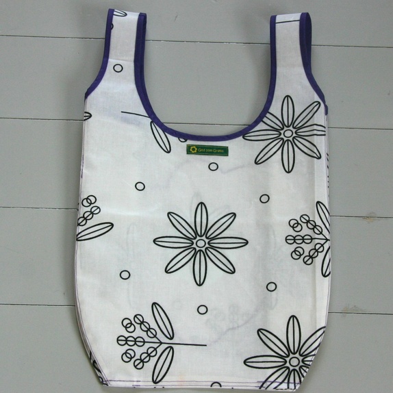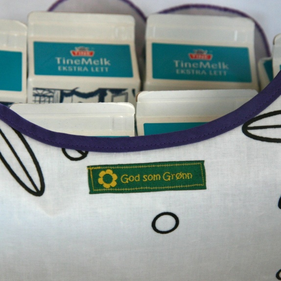 Denne er sydd av hvit voksbelagt bomull med stiliserte sorte blomster på. Pyntet med en stor lilla blomst fra et gammelt dynetrekk. Hovedbildet er dessverre litt mørkt, lillafargen er klarere i virkeligheten. Langs kantene er det lilla skråbånd og bak på posen en God som Grønn-merkelapp.