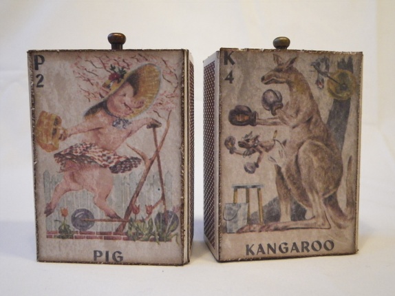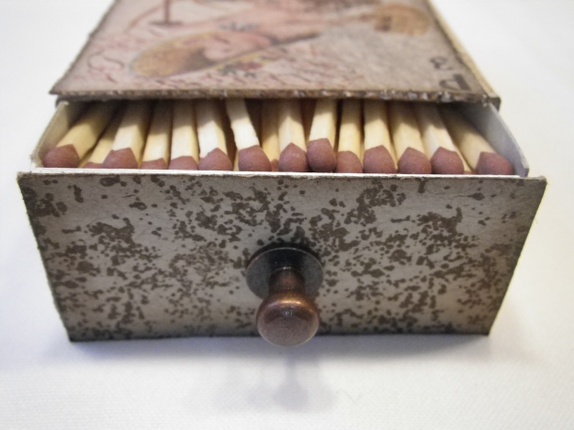 Fyrstikkeskene er pyntet med Tim Holtz mønsterpapir,samme motiv på begge sider.
