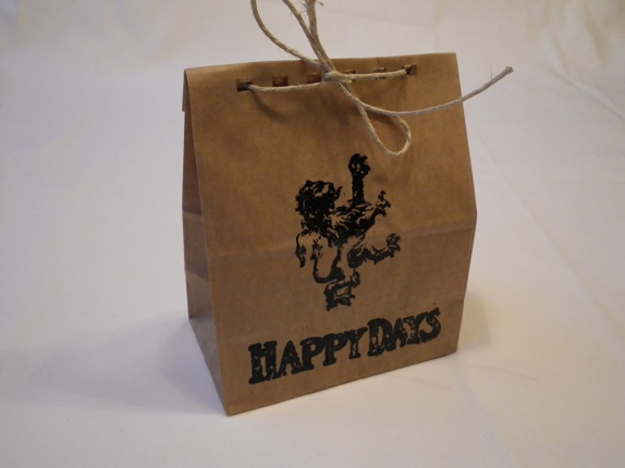 Gaveposen er av gråpapir og er knyttet sammen med hyssing.