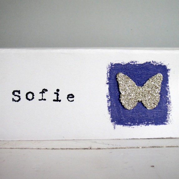 Dette er en reservert ordre som består av 15 stk bordkort med navn og sølv sommerfugl på grålilla maling.