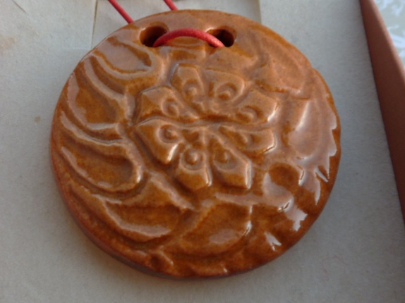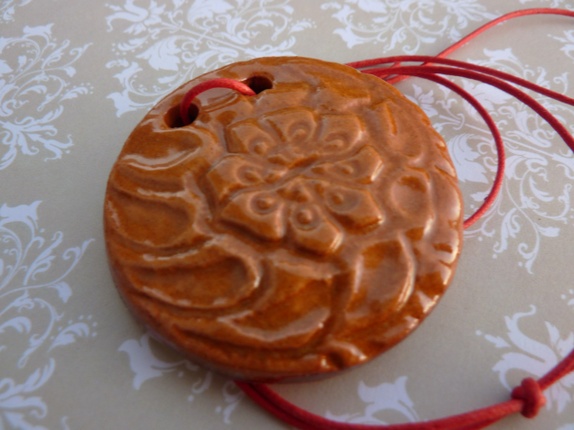 Halssmykke er laget av leirgods som og har en diameter på 5 cm. Orange bomullsnor med regulerbar knute.