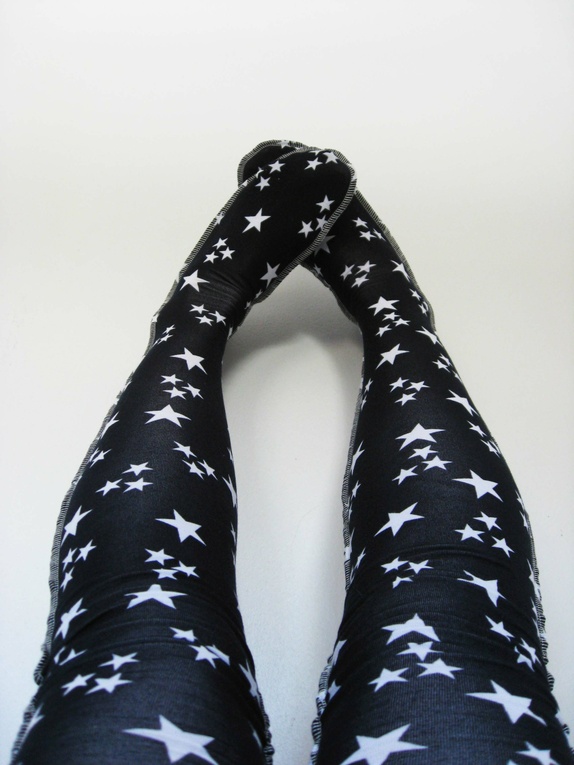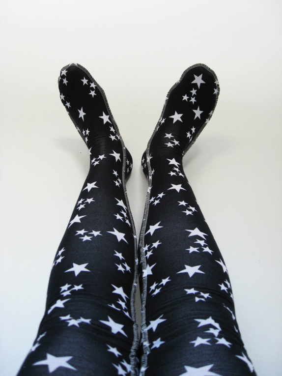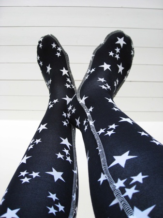 Lange, deilige knestrømper som rekker godt over knærne. De er sydd i mørk blå bomullsjersey med stjerner i skinnende hvitt. Knestrømpene er fasongsydd med en dekorativ overlocksøm på utsiden og i avslutningskanten oppe. De finnes i 2 størrelser: 36-38 og 39-41.
