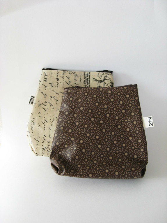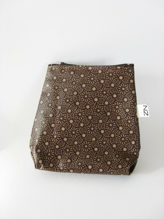 Liten brun pung med beige blomster som har plass til de små viktige tingene: penger, mobil og nøkler og slikt.