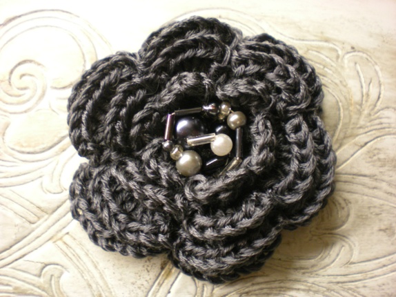 Heklet brosje i merisert garn (blankt garn) med pålimt matchende perler i midten og påsydd brosjenål bak.