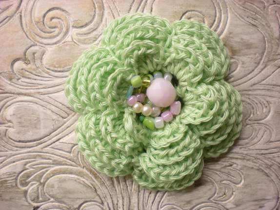 Heklet i tynt bomullsgarn med pålimt perler i rosa/grønt i midten og påsydd brosjenål bak.