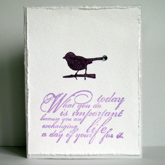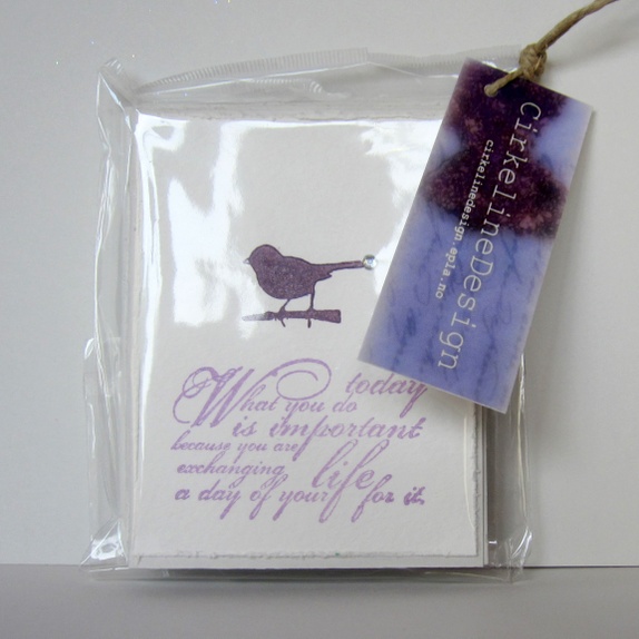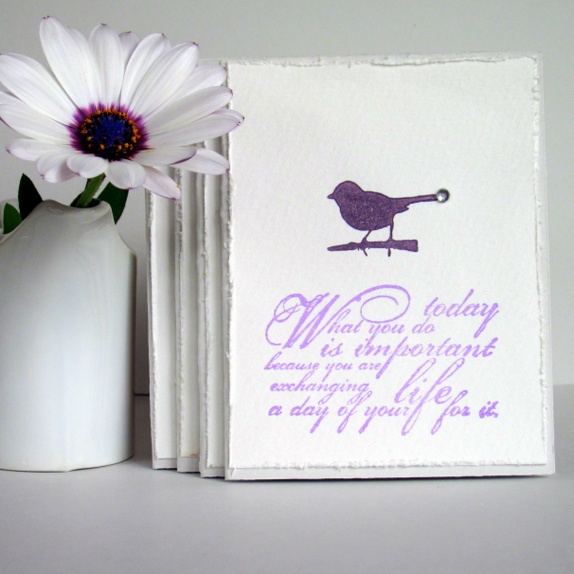 De er dekorert med akvarellpapir med en håndstemplet fugl i mørk lilla med bling på halen. Noen visdomsord om viktigheten av dagen i dag er håndstemplet i lys lilla.