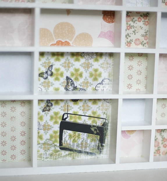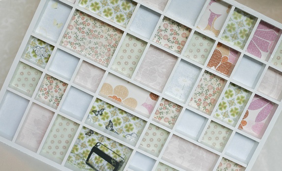 Stor settekasse, malt hvit og dekorert med kvalitetspapirer og -tapet.