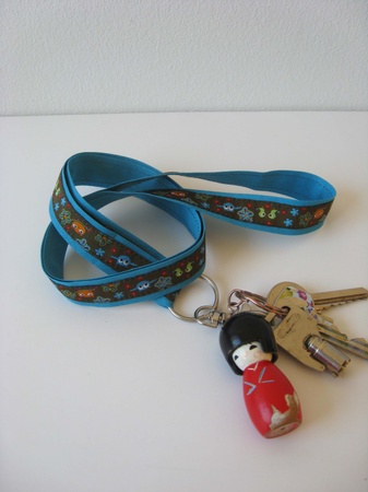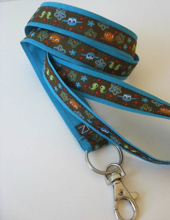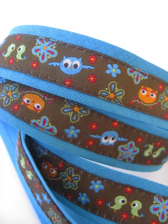 Nøkkelbånd sydd av nydelig, vevd bånd med turkis skråbånd på baksiden. Båndet er brunt med motiv av oransje og blå ugler, grønne turtelduer og blomster i blått og litt rødt...