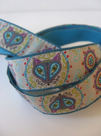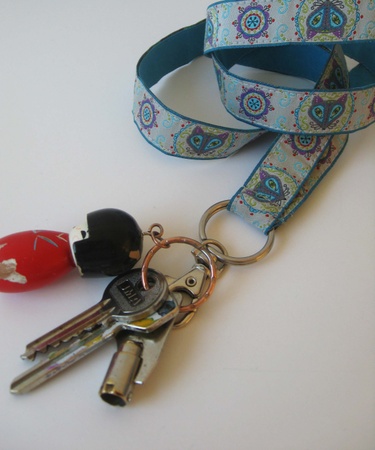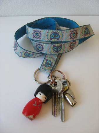 Nøkkelbånd sydd av et nydelig, vevd bånd med turkis skråbånd på baksiden. Båndet er lyst grått med ornamenter og motiv av lilla sølrever, og en vakker rosett i turkis, rødt, grønt og lilla.