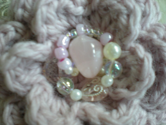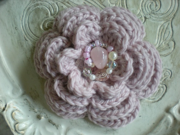 Heklet i ullgarn og pyntet med pålimt perler i midten og påsydd brosjenål bak.