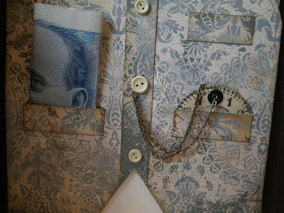 Pyntet med stempel, brads, knapper, kjetting og silkebånd.