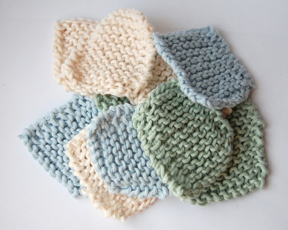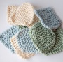 Bomullspads i delikate pastelfarger, strikket for hånd.