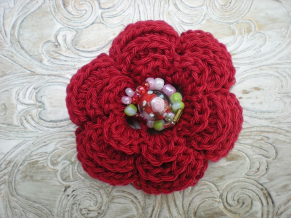 Heklet i tynt bomullgarn og pyntet med pålimt perler i midten og påsydd brosjenål bak.