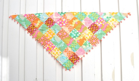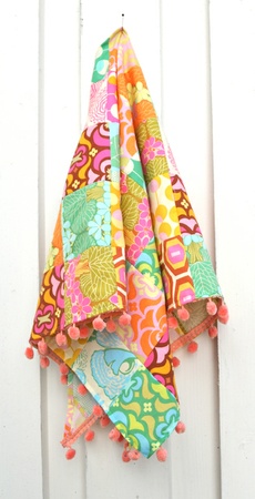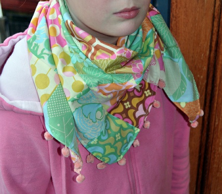 Lappeskjerf i turkis, rosa og orange med en kant av rosa pompom.Sjalet er i 100% bomull og ca 85x85x125 cm stort.(Det er ikke foret)