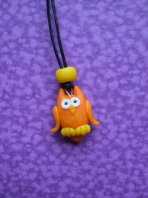 Anheng håndlaget av cernit.Ugle 2,7 cm høy.Perle 0,5.Regulerbar syntetisk skinnsnor.