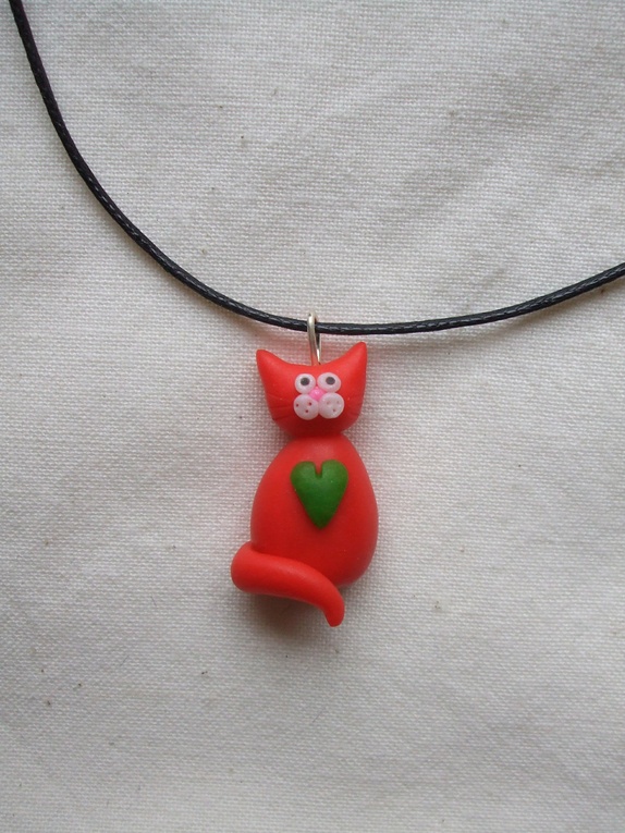 Håndlaget anheng av cernit.Høyde 2,5 cm.Regulerbar syntetisk skinnsnor.