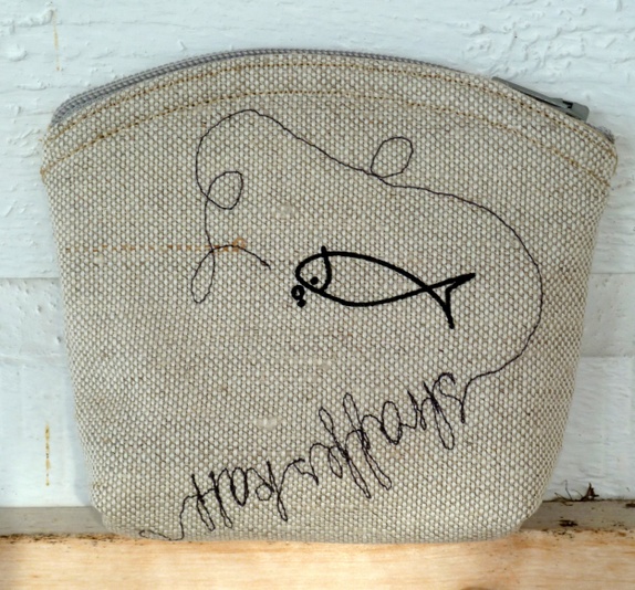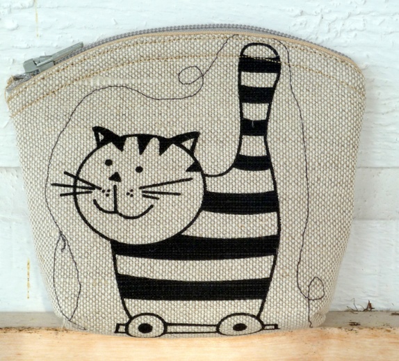 Pung i lin m/ Kattemotiv og frihandsbrodering/tekst ("straffes katt") på baksida.Vattert og fora.Mål: 10cm x 11cm. Botn 3,5cm.