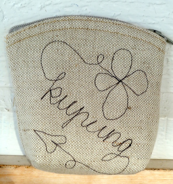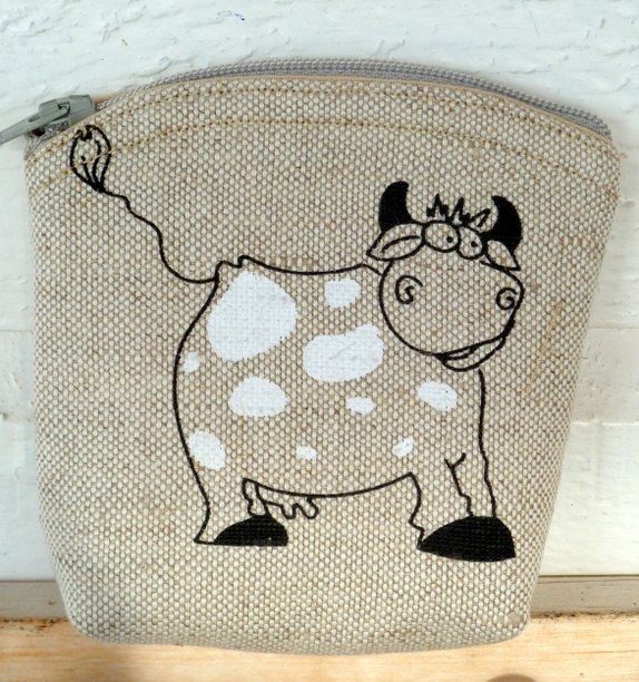 Pung i lin m/ kumotiv og frihandsbrodering/tekst ("kupung") på baksida.Vattert og fora.Mål: 11cm x 11cm. Botn 3,5cm.