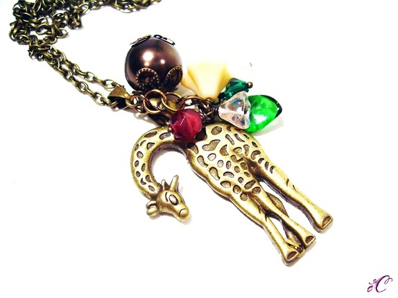 Langt kjede med flott giraffanheng. Glassperler i farger inspirert av Afrika omkranser giraffen.