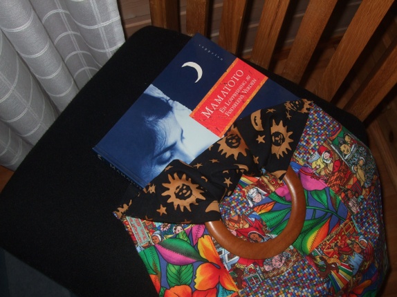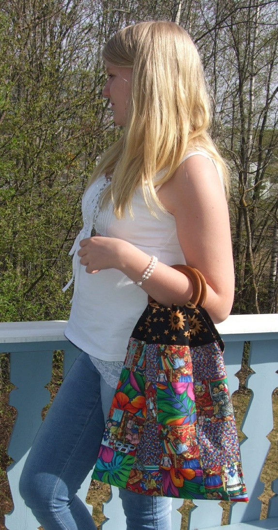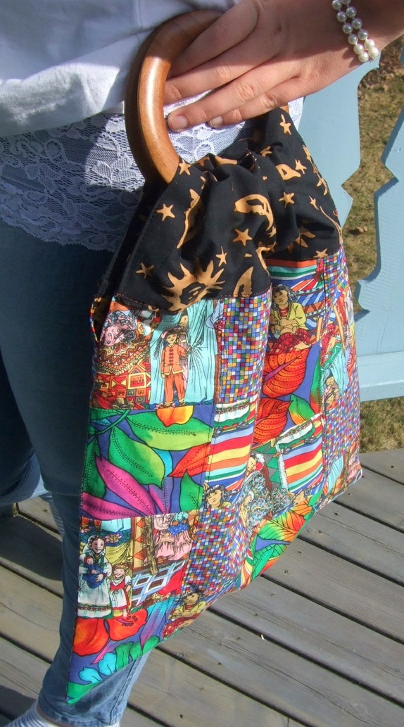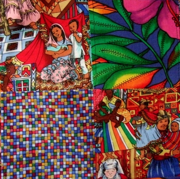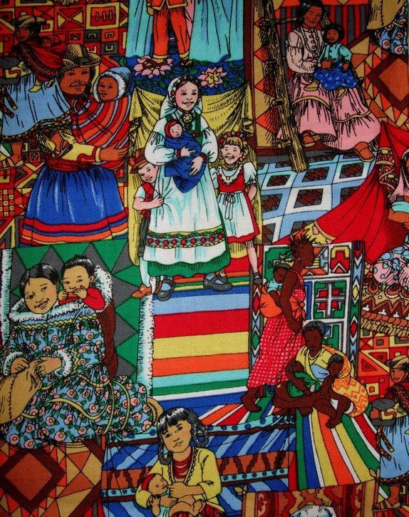 Til lappene har jeg brukt stoffer med blomstermotiv, rutete mønster og sist, men ikke minst: et morsomt stoff ved navnet "World Mothers", der mødre og barn fra alle verdensdeler er representert (se nærbilde av stoffet).