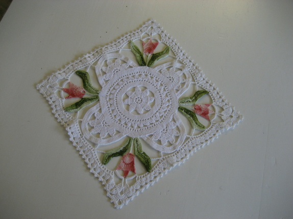 Nydelig romantisk brikke heklet av bestemoren min, i hvitt, rosa og grønt.