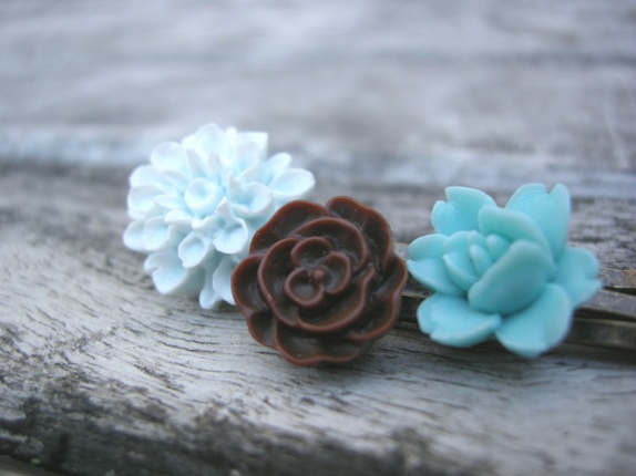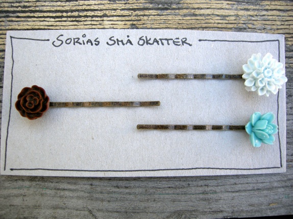 3 nydelige hårspenner i blå toner og sjokolade brun.Hårnål i oksydert kobber med akrylblomster.Limet er profesjonelt smykke lim og etterpå lagt i herder. Hver spenne måler ca 5,5 cm.