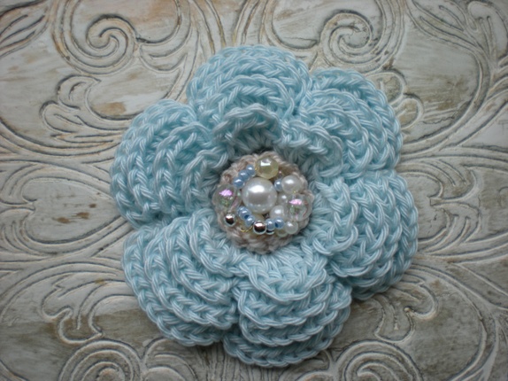 Heklet i tynt bomullsgarn med pålimt perler i midten og påsydd brosjenål bak.