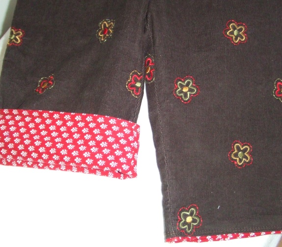 Buksen er sydd av brun babycord og er foret med rødt bomullstoff. Den måler 69 cm fra skulder og ned, men fordi den er foret kan den brettes opp til ønsket lengde.