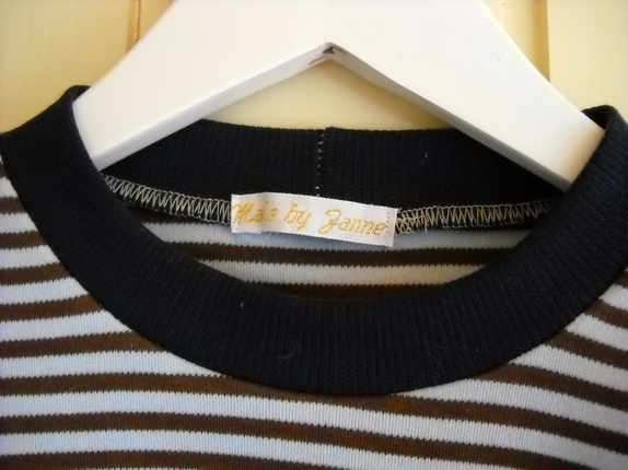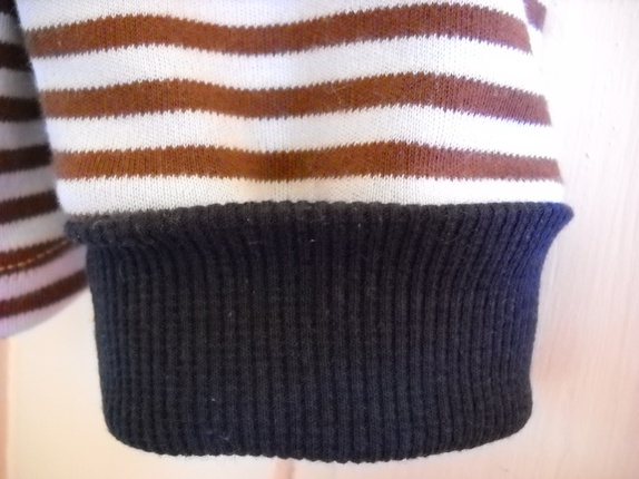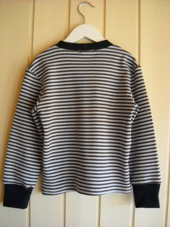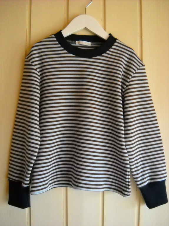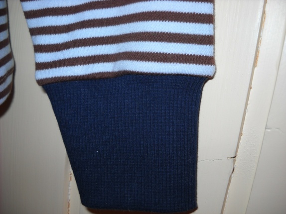 Brun og lyseblå bomullsgenser med mørk blå ribbkant. Str ca 4 år. Lengde: 44cm. Bredde: 35 cm. Armlengde: 40cm, men kan brettes opp. Myk og god!