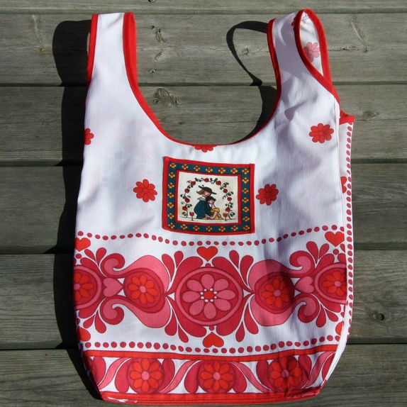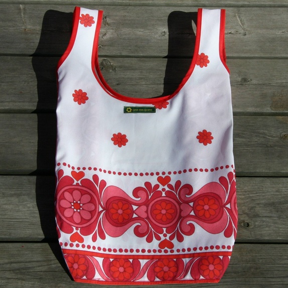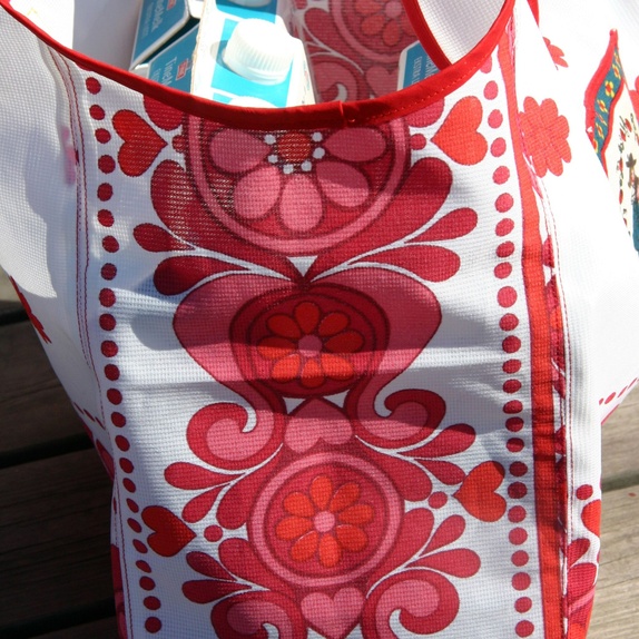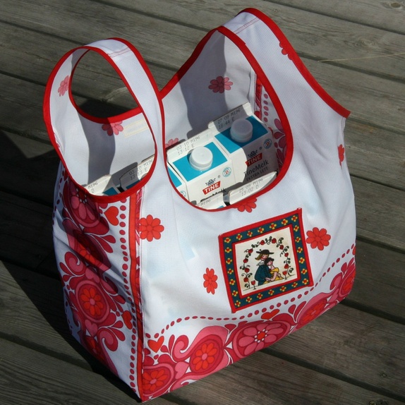 Posen er sydd etter modell av de i plastikk og rommer utrolig mye - du får enkelt en hverdagshandel i en slik - for helge- og høytidshandel trenger du nok noen flere. Den er mye mer behagelig å bære enn engangsposene og du slipper å engste deg for at posen ryker selv om du har handlet melk til hele familien (den rommer minst 8 liter).
