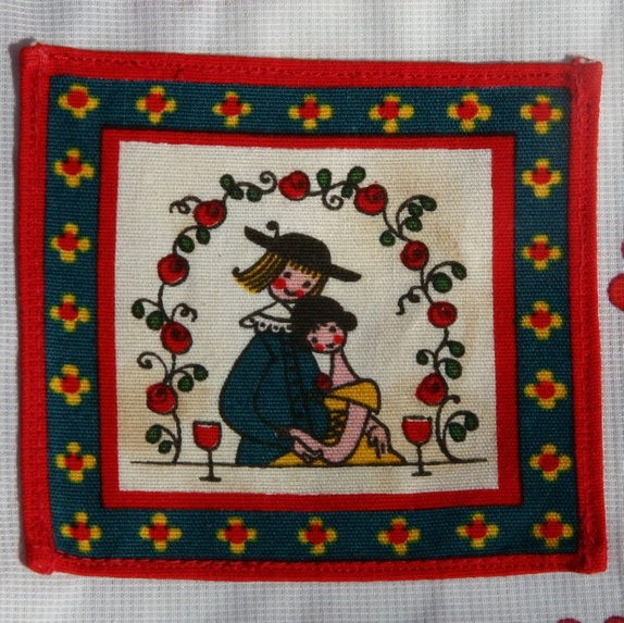 Denne er sydd av en skikkelig syntetisk rysjekjøkkengardin med rosarødtoransje blomstermønster. Pyntet med tekstilbrikke med bilde av et forelsket par. Dessverre er det noe kaffestenk på denne som ikke går av i vask. Rødt skråbånd på hankene.