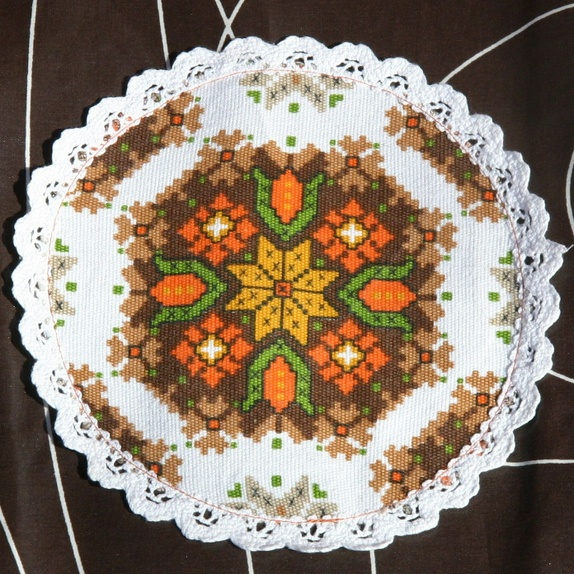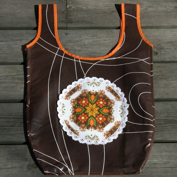 Denne er sydd av brun voksbelagt bomull fra IKEA og dekorert med en liten fake-korssting- og blondeduk fra loppis. Hankene er kantet med oransje skråbånd.
