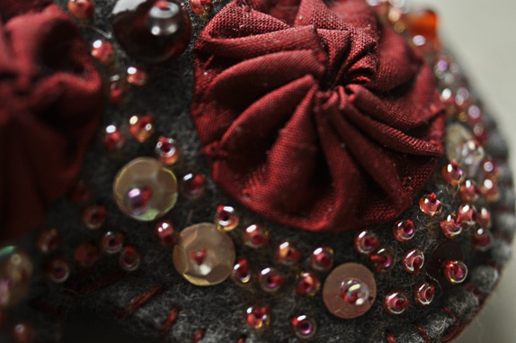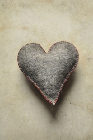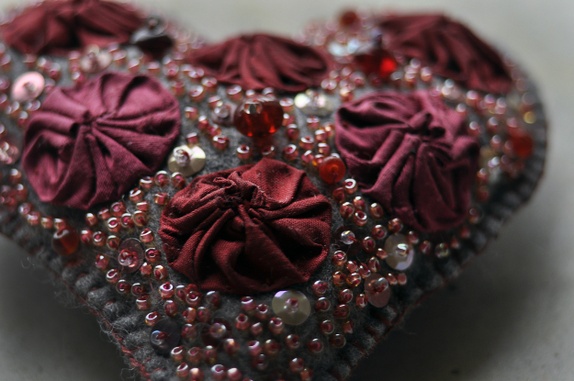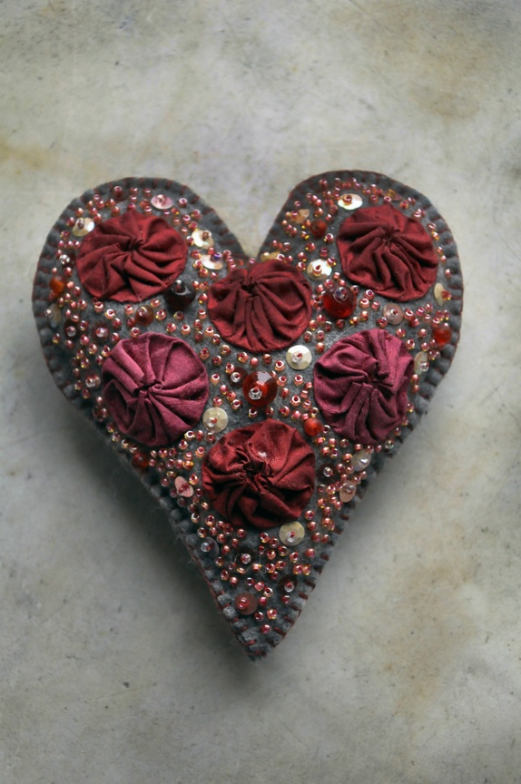 Hjerte i grå vadmel, dekorert med perler,silke og paljetter.Høyde 13 cm.Bredde 12 cm.