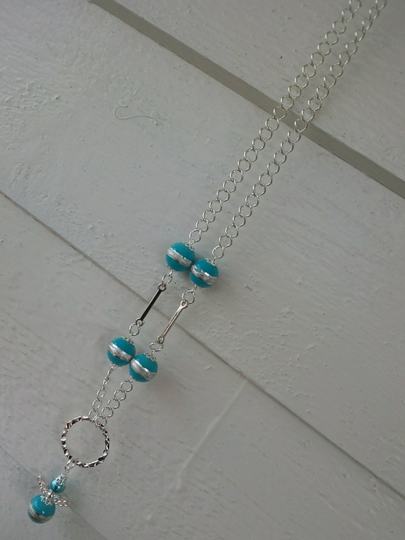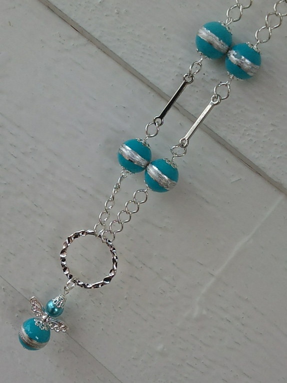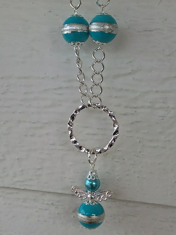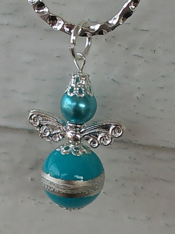 Halskjede laget av lenke og turkise flotte glassperler, med metalldetaljer, og engle-anheng.