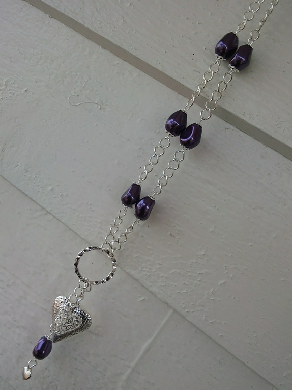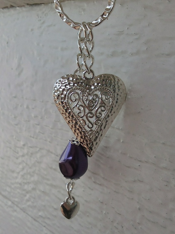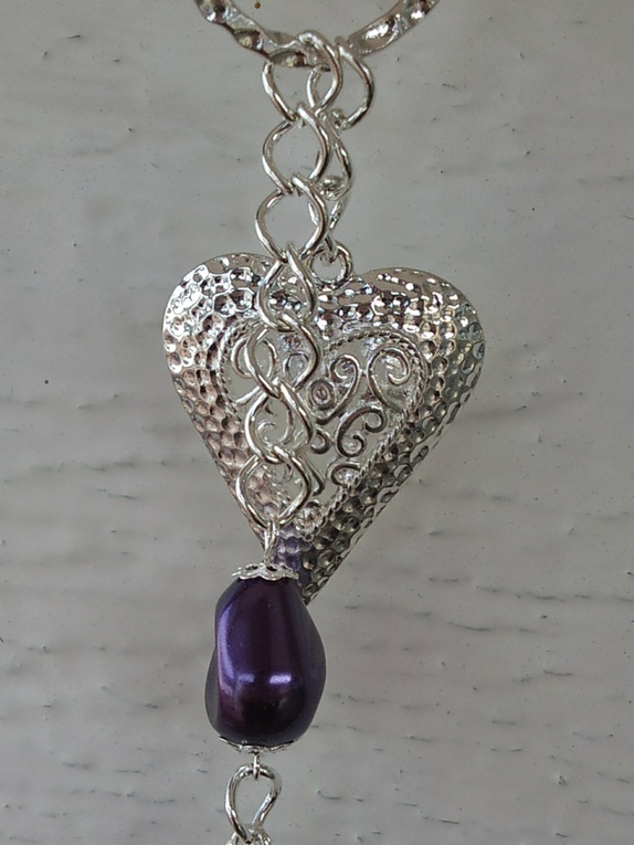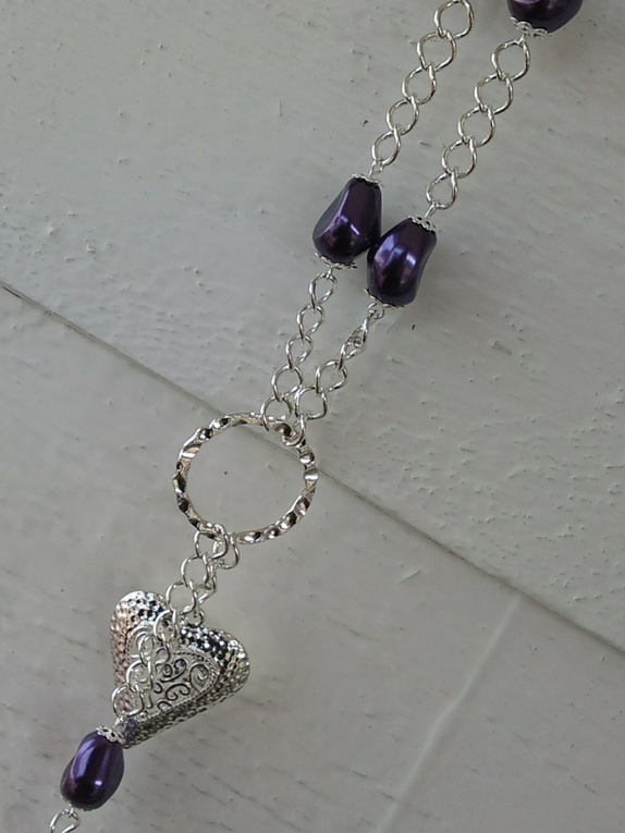 Halskjede laget av lenke og lilla flotte glassperler, med metalldetaljer, og hjerteanheng.
