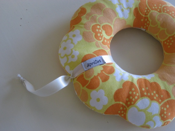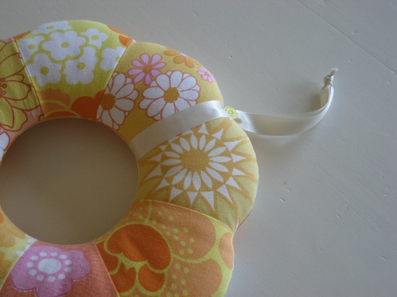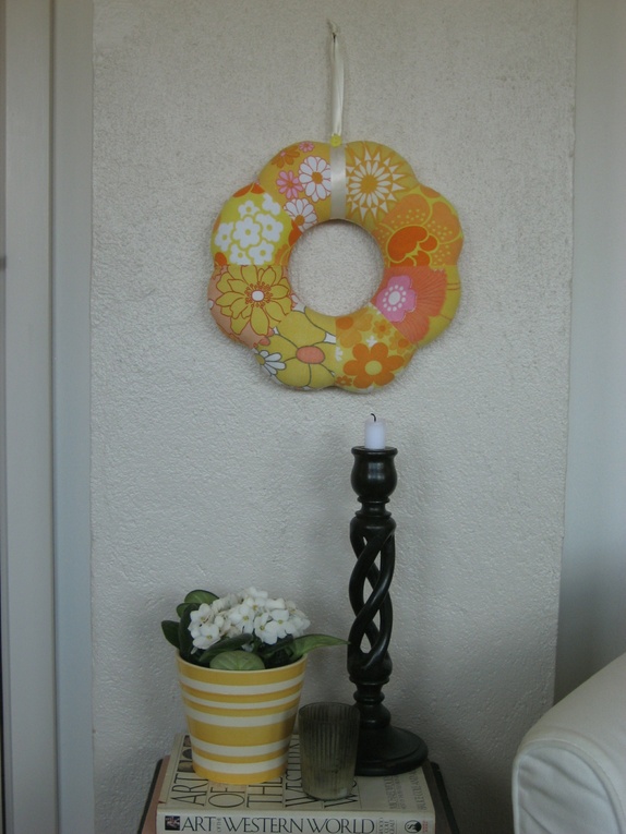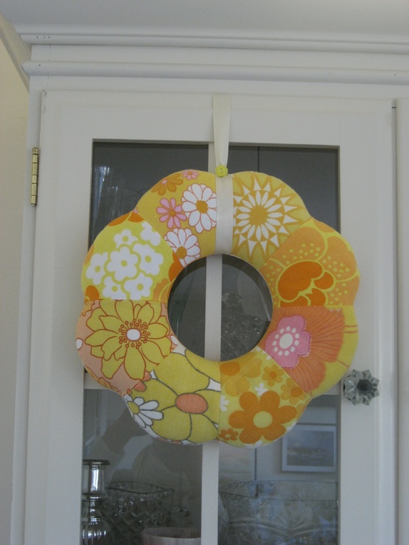 Fargene går i gult, orange og rosa. Baksiden er et flott retrostoff i gult, så kransen kan brukes på begge sider. Opphenget er et off-white satengbånd, pyntet med en vintage gul knapp. Kransen er fòret med strykeinnlegg og fyllt med fibervatt.