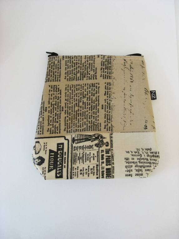 Mellomstor, beige pung med skrift og bilder i svart som har plass til litt sminke, smykker eller andre hemmeligheter.