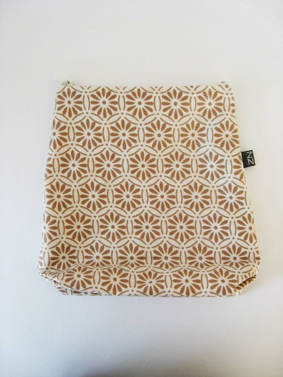 Mellomstor pung i lys beige med mørke beige blomster. Her er det plass til litt sminke, smykker og andre hemligheter?